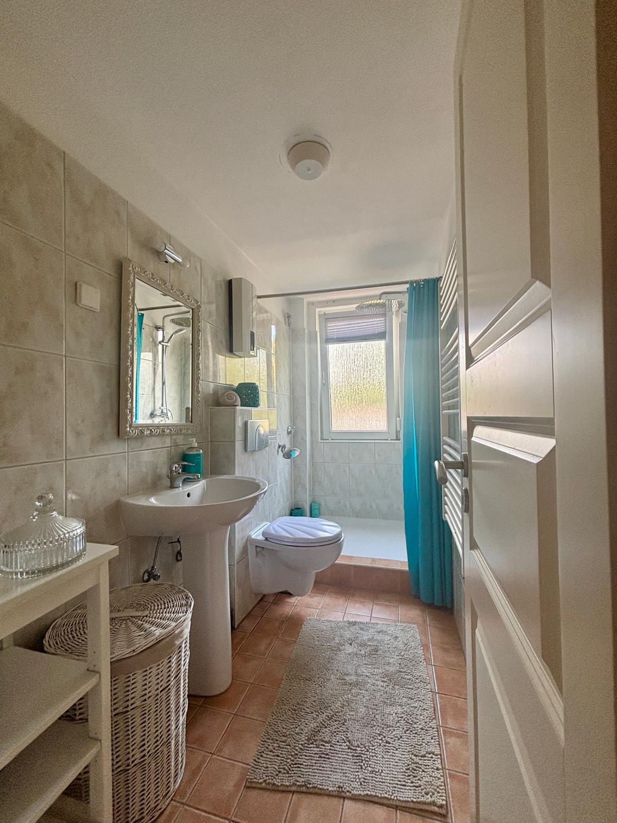 Der hintere Teil der Wohnung überrascht mit zwei liebevoll gestalteten Tageslichtbädern. Das eine praktisch und modern als Duschbad, das andere als kleine Wellness-Oase mit großer Eckbadewanne und mediterranem Flair – perfekt, um nach einem langen Tag zur Ruhe zu kommen. Dazwischen liegt das gemütliche Schlafzimmer, das mit seiner optimalen Größe genug Platz für einen großen Kleiderschrank und eine persönliche Wohlfühlecke bietet. Ergänzt wird dieser Bereich durch eine praktische Abstellkammer oder Garderobe, die sich ideal in das Raumkonzept einfügt.