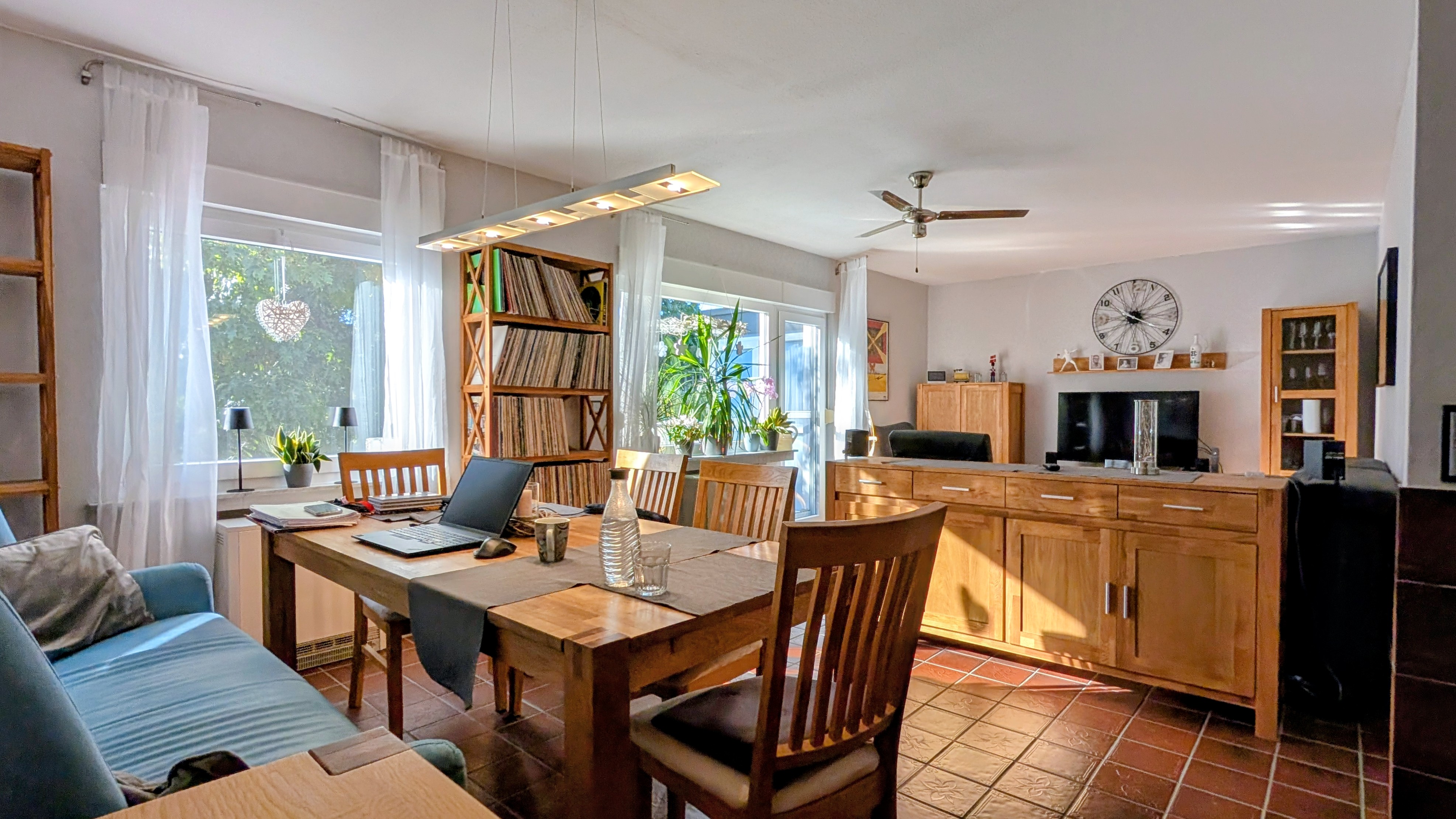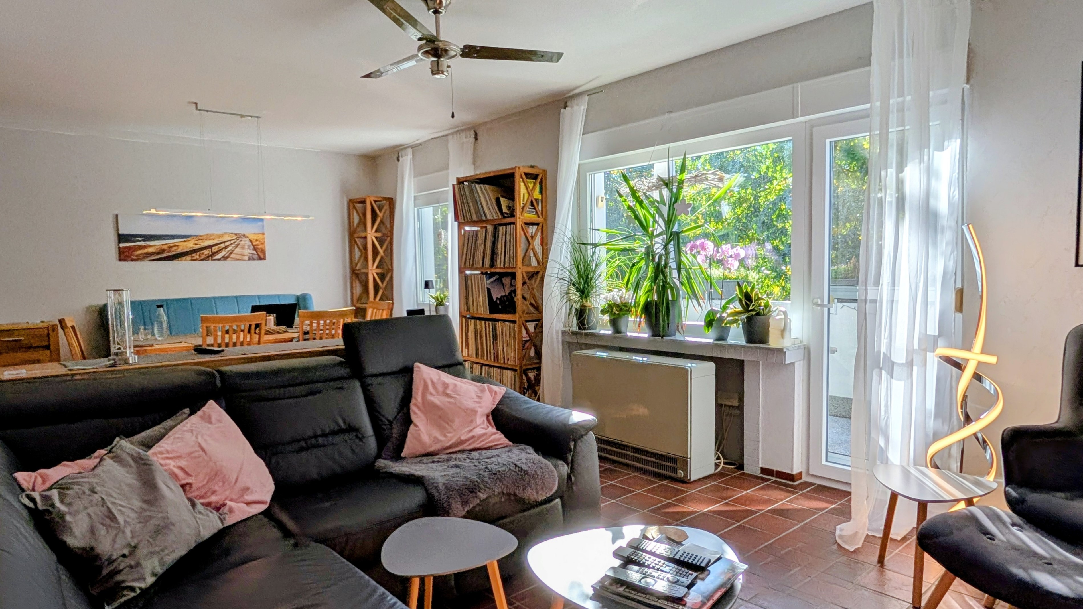 Der Wohn- und Essbereich mit Zugang zum sonnigen Süd-Balkon, zwei Schlafzimmer, eine Küche sowie ein 2019 modernisiertes Bad schaffen ein wohnliches Gesamtbild. Ein Gäste-WC, Fenster mit Rollläden und Insektenschutzgitter bieten zusätzlichen Komfort.