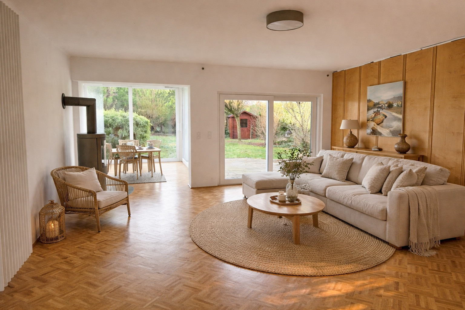 Besondere Highlights sind der lichtdurchflutete Wohnbereich mit Wintergarten und Gartenblick, die großzügige Wohn-/Essküche mit Terrassenzugang, mehrere flexibel nutzbare Zimmer sowie ein Elternschlafzimmer. Große Sprossenfenster sorgen in allen Wohnräumen für eine angenehme Wohnatmosphäre.